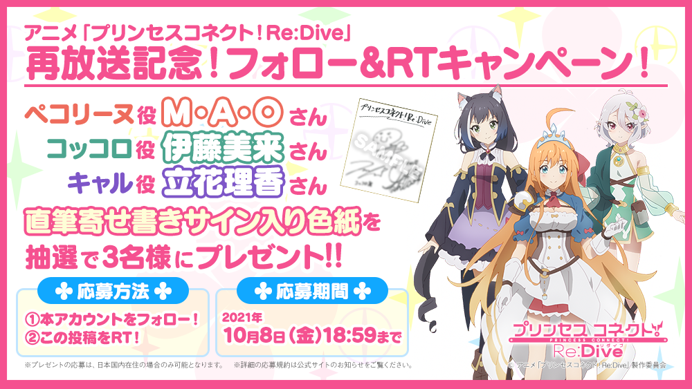 ペコリーヌ役 M・A・Oさん、コッコロ役 伊藤美来さん、キャル役 立花理香さんの直筆寄せ書きサイン入り色紙が抽選で3名様に当たります。